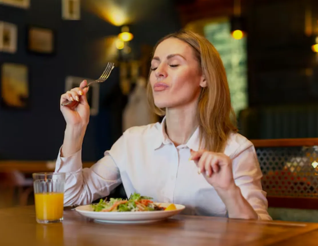 - دىققەتنى مەركەزلەشتۈرۈش: تاماق يېگەندە تېلېۋىزور كۆرمەڭ، يانفون ئوينىماڭ. پەقەت يېمەكلىكنىڭ تەمى، پۇرىقى ۋە تۇيغۇسىغا دىققەت قىلىڭ.