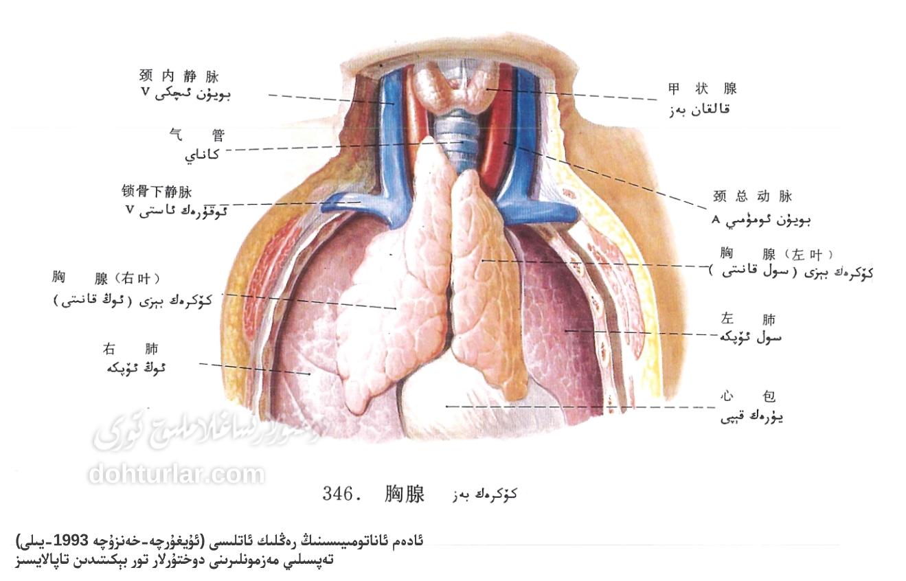 بويۇن ئومۇمىي ئارتېرىيەسى يۈرەكتىن چىقىپ، بويۇننىڭ ئىككى تەرىپىدە ماڭىدىغان چوڭ ئارتېرىيە بولۇپ، مېڭە ۋە باشقا بويۇن قىسىملىرىغا قان بىلەن تەمىنلەيدۇ. - كۆكرەك بېزى سول قانىتى (Left Lobe of Thymus, 胸腺左叶)