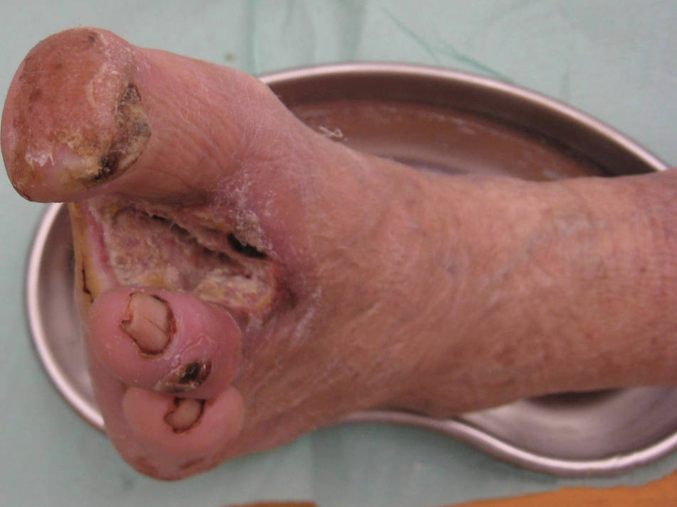 رەسىم ۋىكىپېدىيادىن ئېلىندى. دىئابېت پۇت بارماق كېسىۋېتىلگەن سۈرىتى. بەزىدە تېخىمۇ يۇقىرى قىسىمدىن كېسىشكە توغرا كېلىپ قالىدۇ. رەسىم مەنبەسى