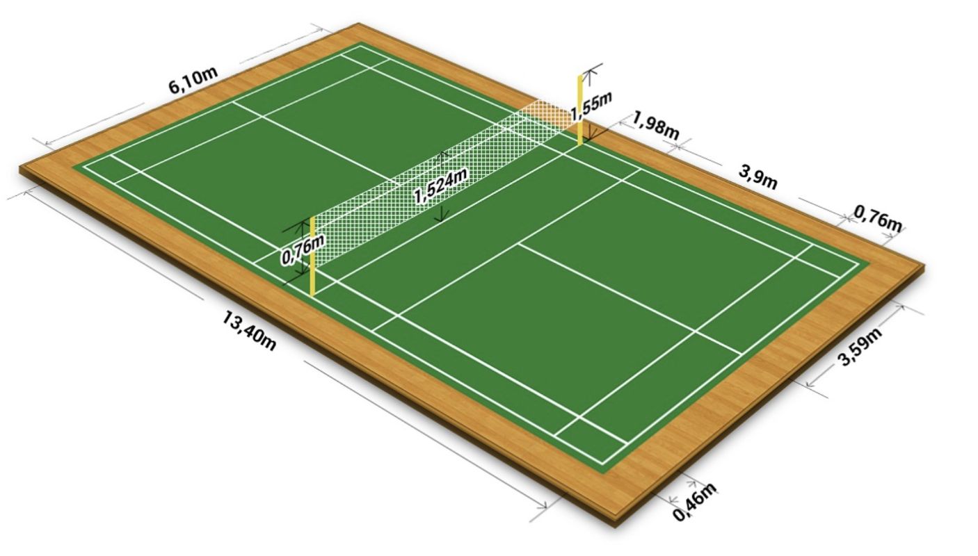 - مەيدان: تىك تۆت بۇلۇڭ شەكلىدە بولۇپ، ئۇزۇنلۇقى 13.4 مېتىر. قوش ئويناش (doubles) مۇسابىقىسىدە كەڭلىكى 6.1 مېتىر، يەككە ئويناش (singles) مۇسابىقىسىدە بولسا كەڭلىكى 5.18 مېتىر بولىدۇ.