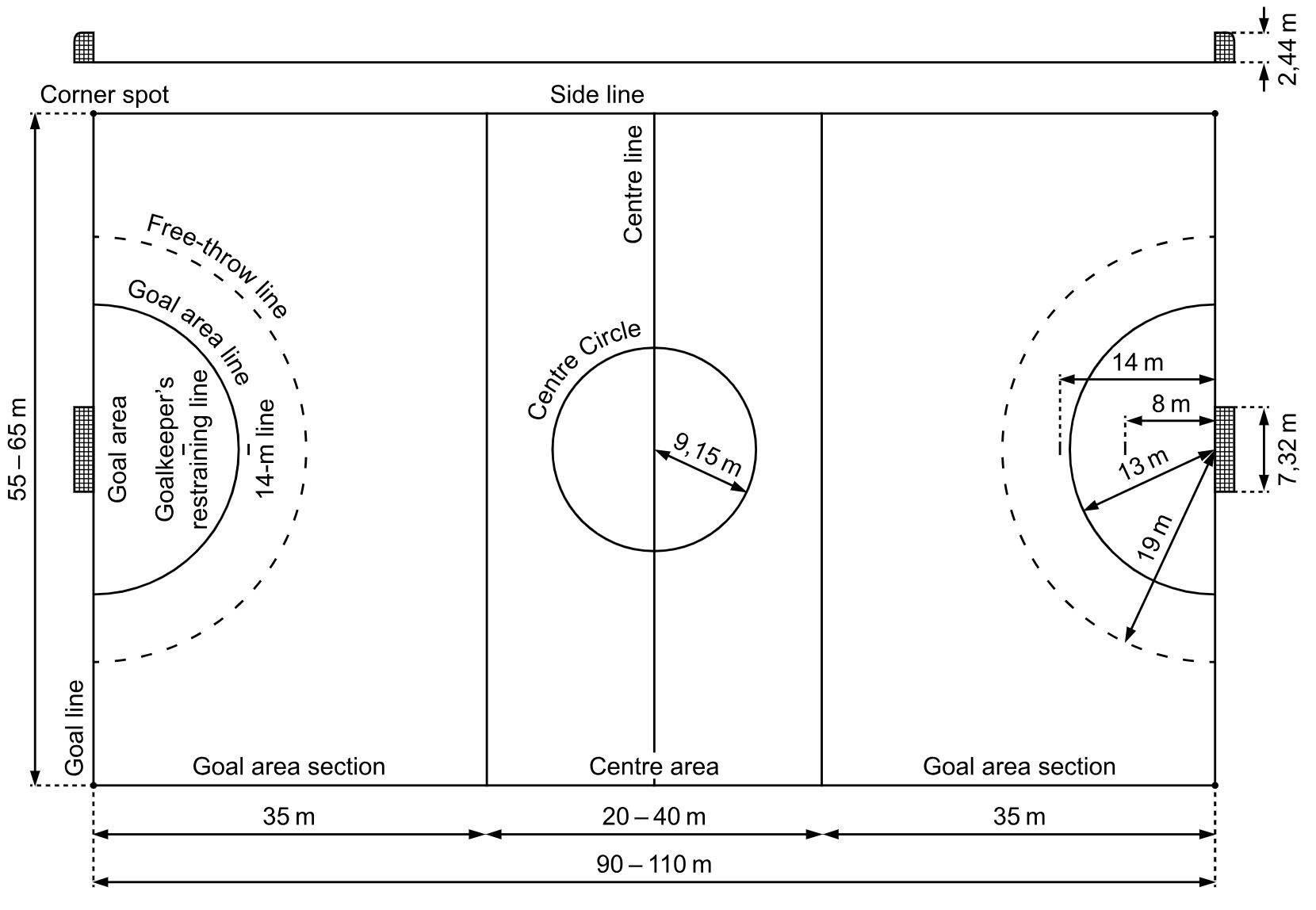 - مەيدان ئۆلچىمى: ئۇزۇنلۇقى 40 مېتىر، كەڭلىكى 20 مېتىر بولغان تىك تۆتبۇلۇڭ.